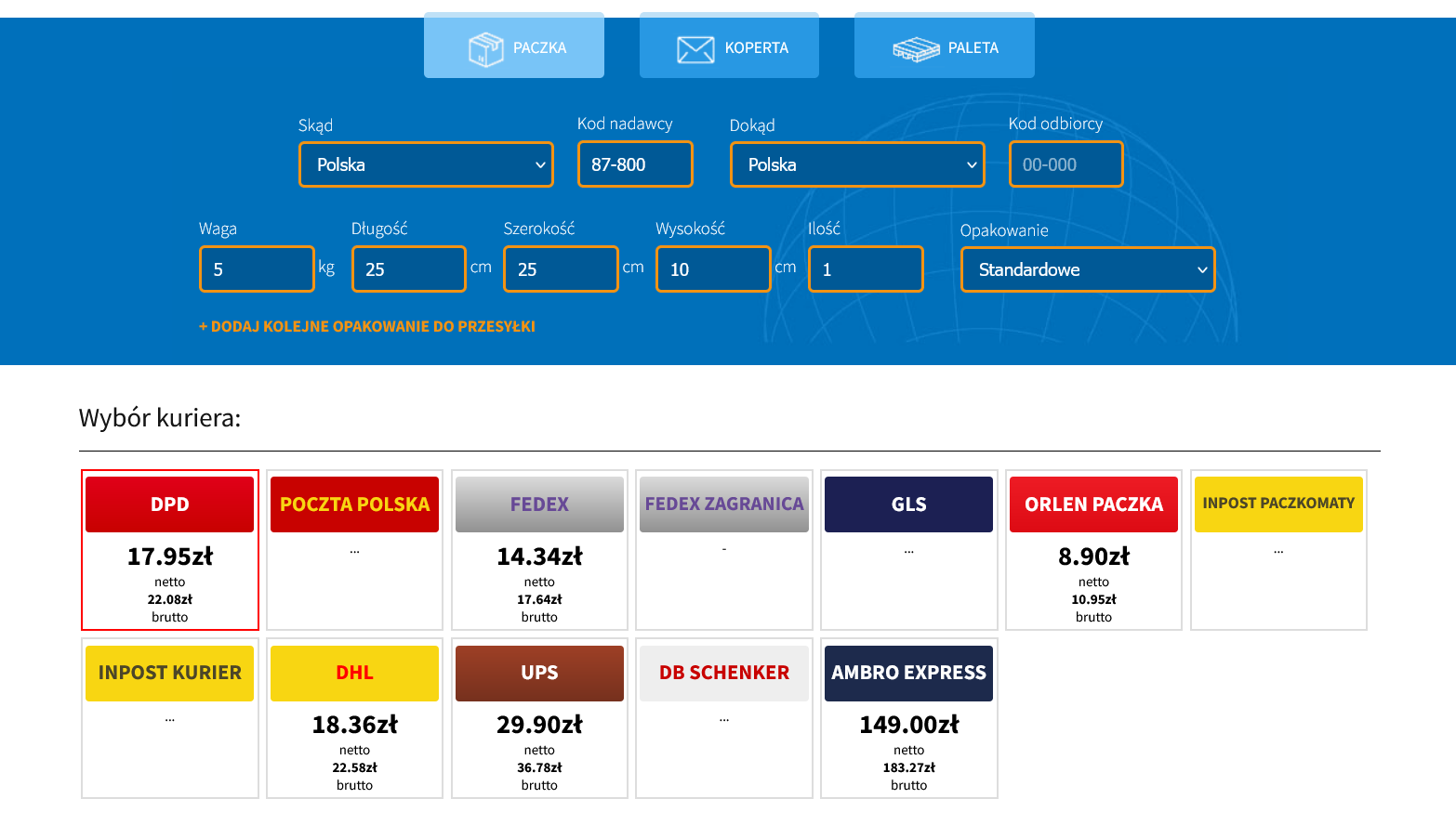 Wybór usług dodatkowych np. pobranie lub ubezpieczenie