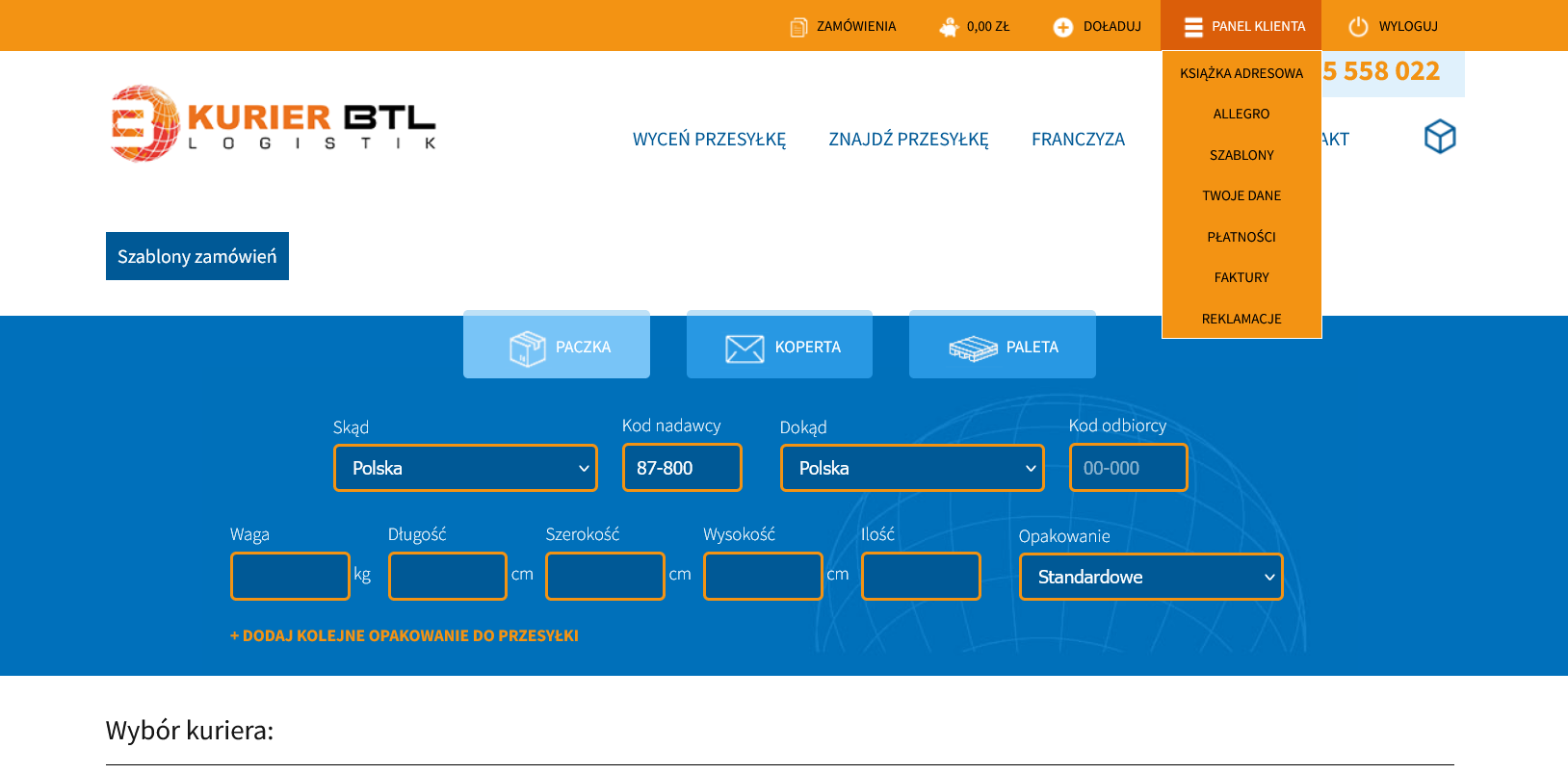 Wpisujemy hasło i login nadane przez Kurier BTL